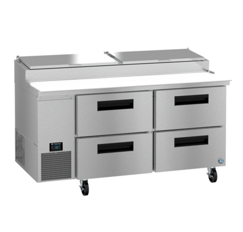 The Hoshizaki PR67B-D4 Pizza Prep Table features four refrigerated drawers, a nine-pan rail, and a polyethylene cutting board. Its stainless steel construction ensures durability, while the self-contained refrigeration system keeps ingredients fresh.